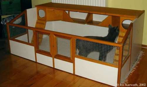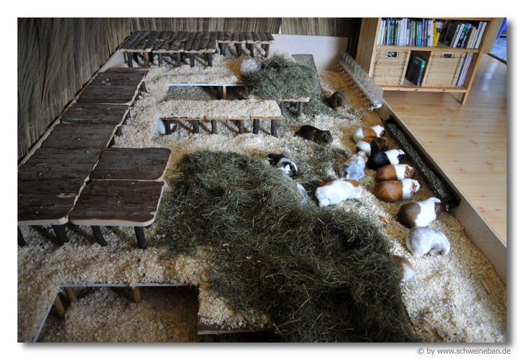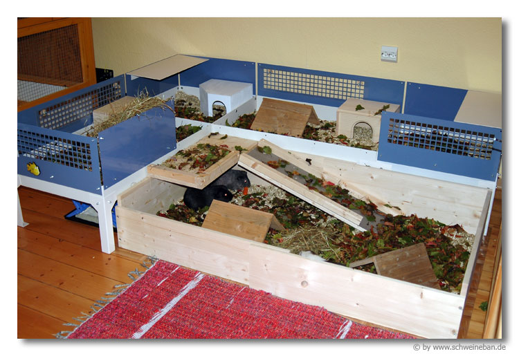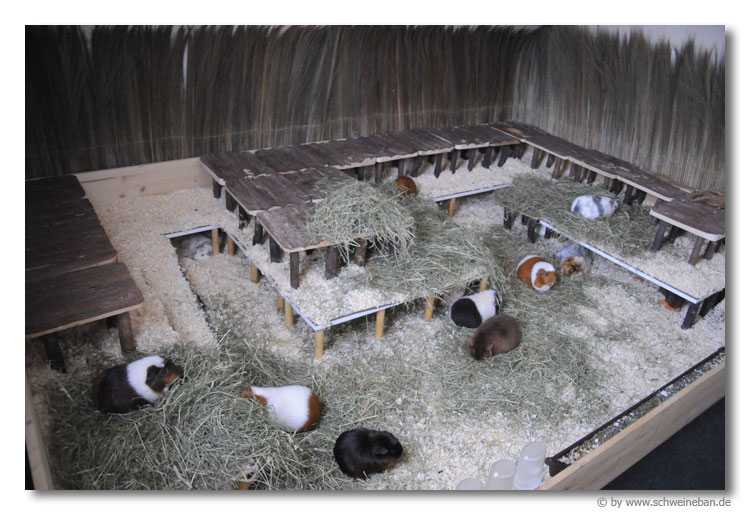 Einrichtung: 2x Etagen-Unterstände aus beschichtete Spanplatten & Rundhölzer (Standhöhe 20 cm, Fläche 40 cm x 80 cm), 1x Etagen-Unterstand (Standhöhe 20 cm, Fläche 20 cm x 60 cm), 5x Unterstände aus Naturholz (z.B. erhältlich bei www.cavialand.de), 2x Rampen aus Leimholz (40 cm x 20 cm, mit Fußmatte bespannt)