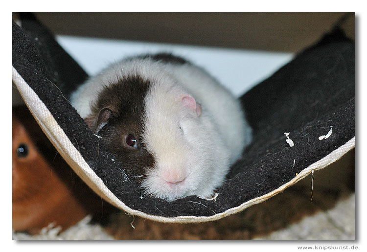 Viele Schweinchen schätzen Hängematten sehr. Man kann sie kaufen oder mit einfachen Mitteln auch selbst basteln. Alles was man dazu braucht ist ein Handtuch passender Größe und Seilklammern (für Vorhänge; gibt es günstig im Baumarkt). Die Seilklammern an der vier Ecken festclipsen, die Haken am Gitter oder in in die Stallwand geschraubte Ösen (ebenfalls im Baumarkt erhältlich) einhängen.