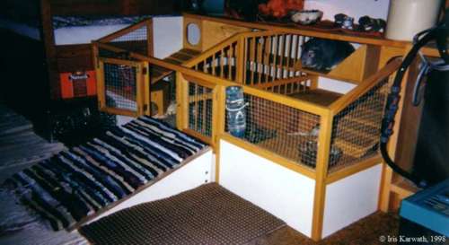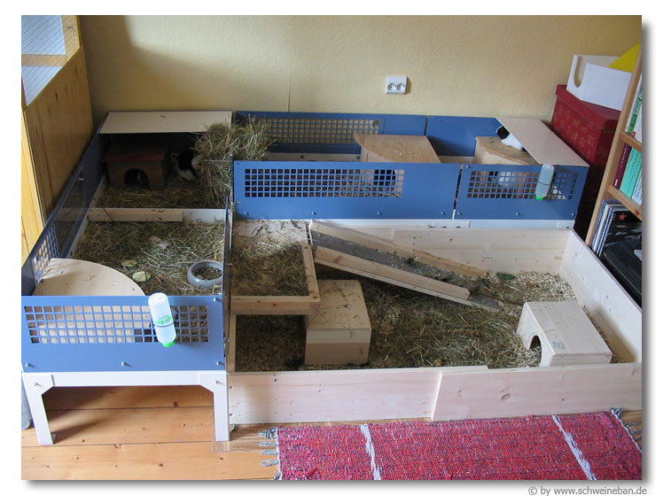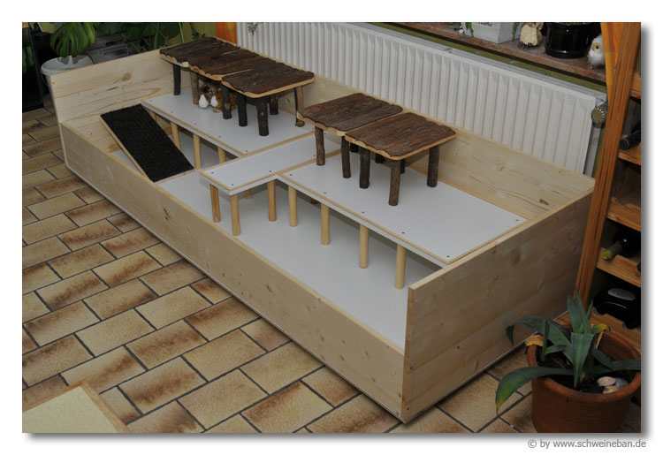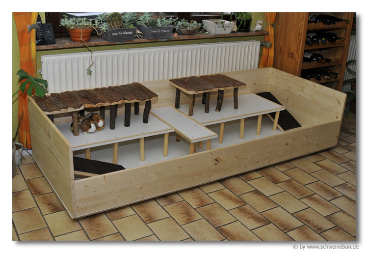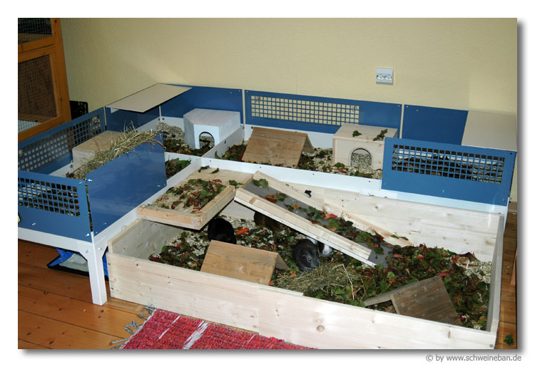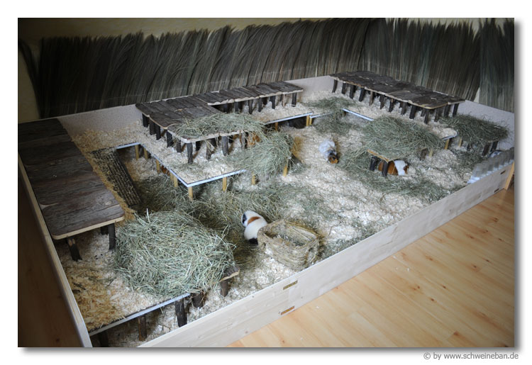 Einrichtung: 2x Etagen-Unterstände aus beschichtete Spanplatten & Rundhölzer (Standhöhe 20 cm, Fläche 40 cm x 80 cm), 1x Etagen-Unterstand (Standhöhe 20 cm, Fläche 20 cm x 60 cm), 5x Unterstände aus Naturholz (z.B. erhältlich bei www.cavialand.de), 2x Rampen aus Leimholz (40 cm x 20 cm, mit Fußmatte bespannt)