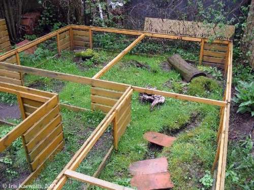 - Innengehege, Kombination aus „Uni-Pig“ von der Firma uni-dom (Grundfläche der 2 Eckelemente 56 cm x 56 cm, Grundfläche der 2 Längselemente je 90 cm x 56 cm) und Anbau-Auslauf (Grundfläche ca. 140 cm x 80 cm):